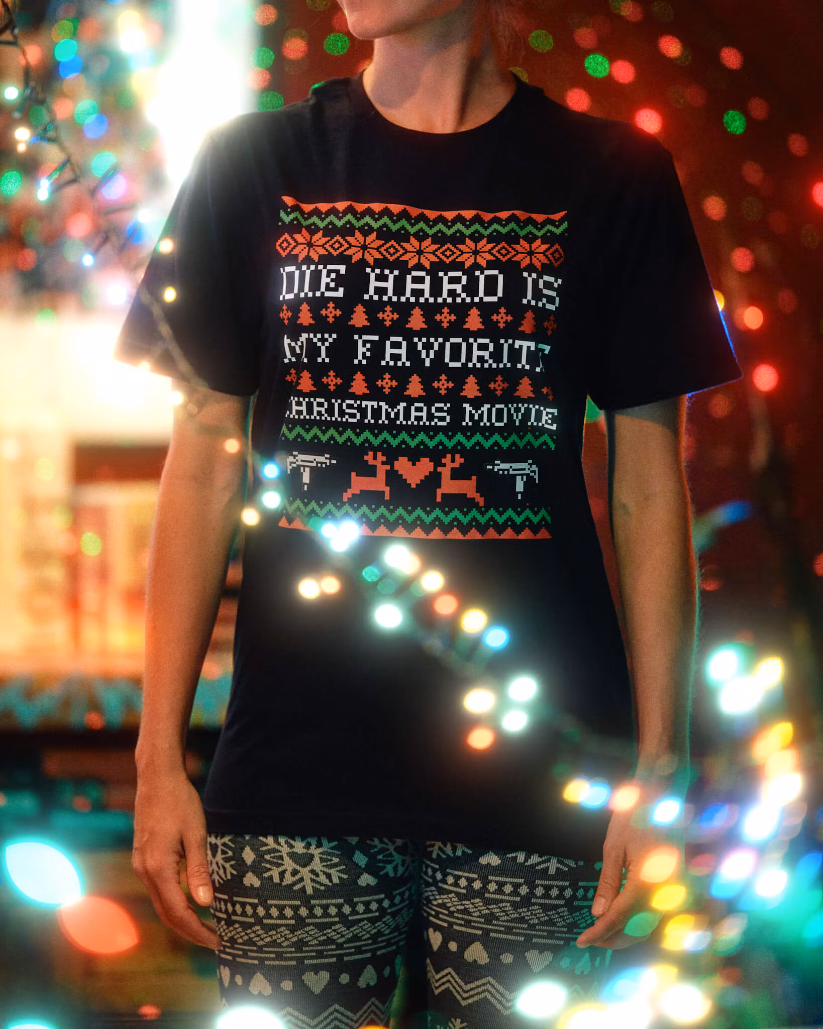 Svart t-shirt med tryck med motivet "Die Hard Is My Favorite Christmas Movie". Trycket påminner om en klassisk stickad jultröja. T-Shirten är i en modern unisex modell och är tillverkad av 100% bomull.