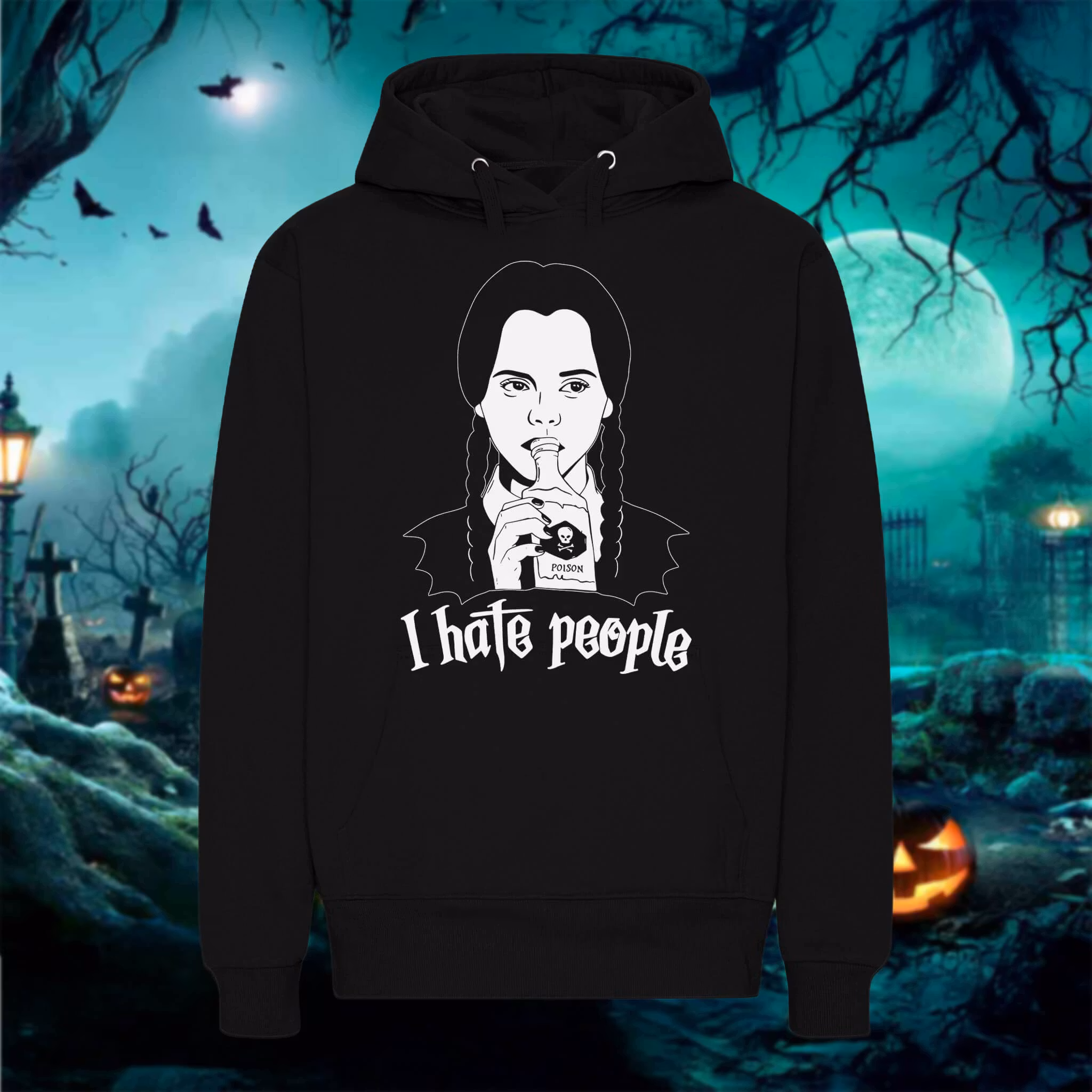 Svart t-shirt med vitt tryck med motiv på Wednesday, under står det "I Hate People". Hoodien är i en modern unisex modell och är tillverkad av 65% bomull och 35% återvunnen polyester. Känguruficka på magen.