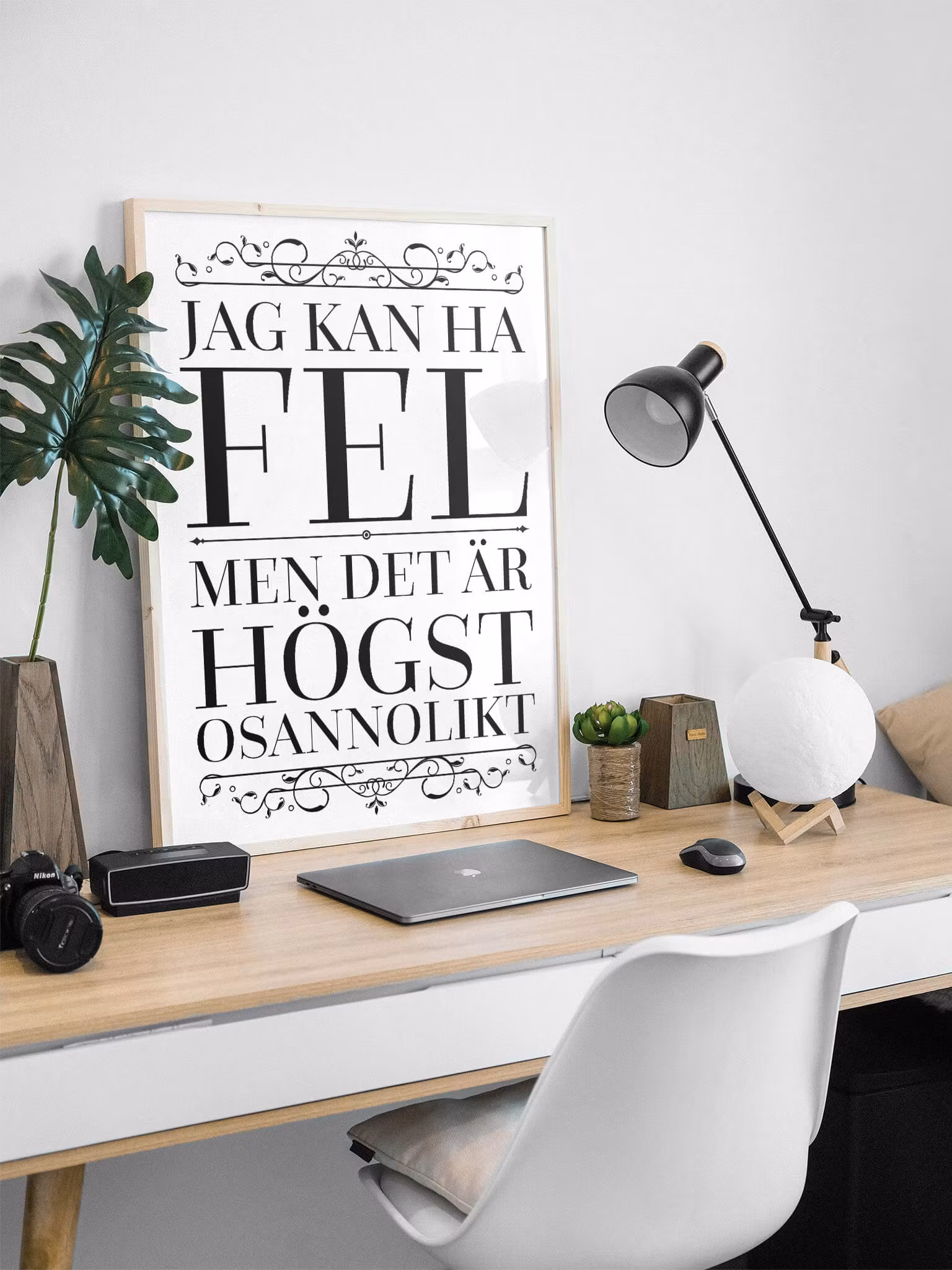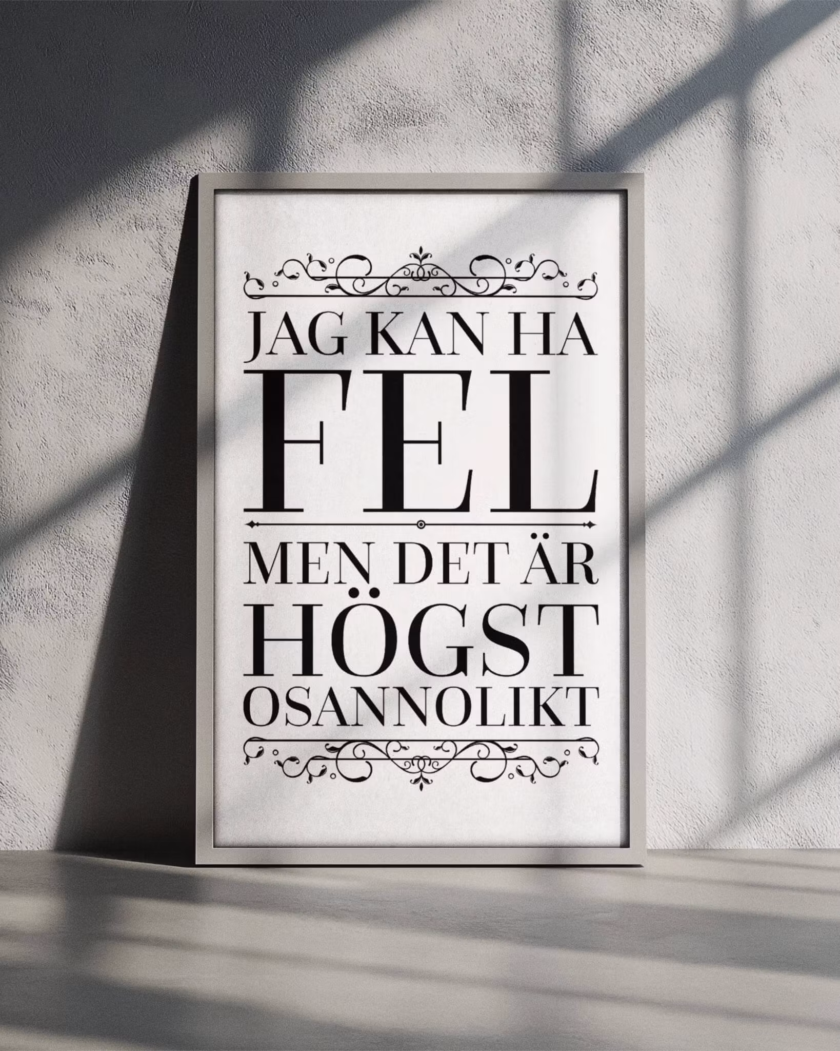 Poster med svart text mot vit bakgrund i elegant stil. Klassiska ornament över och under texten.Rolig texttavla som passar perfekt för besserwisser, eller för p